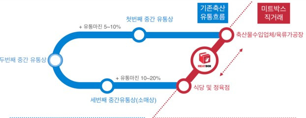 미트박스의 사업모델은 이런 중간 유통상을 거치지 않고 생산자와 구매자를 직접 연결해 주는 서비스이다. 실제 원생산자와 식당 사장들을 바로 연결하여 축산물 가격을 확 낮추는 방식이다.