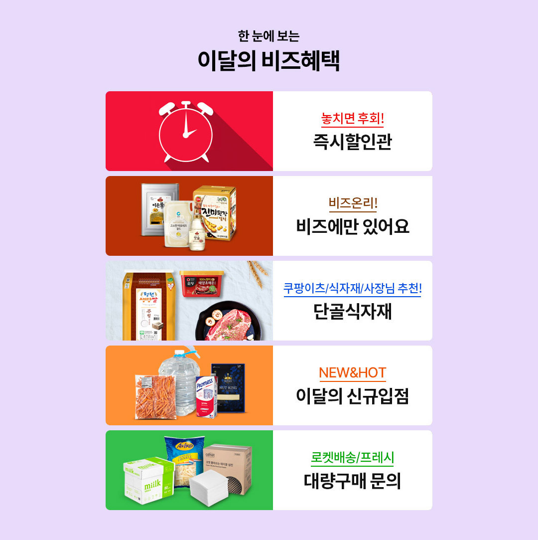 비즈온니관을 통해 오직 쿠팡비즈에서만 구매할 수 있는 상품을 운영하고 있고, 단골식자재관은 식당 운영에 가장 많이 사용하고 필수품목인 대용량 식용유, 장류, 쌀, 정육/계란을 취급함으로써 B2B자영업자들 적극적으로 유혹하고 있다.