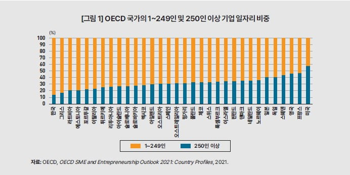 이외도 대한민국은 OECD기준 250인 이상 대기업이 전체 일자리에서 차지하는 비중 14% 수준으로 OECD 32개 중 최하위에 위치하고 있다.