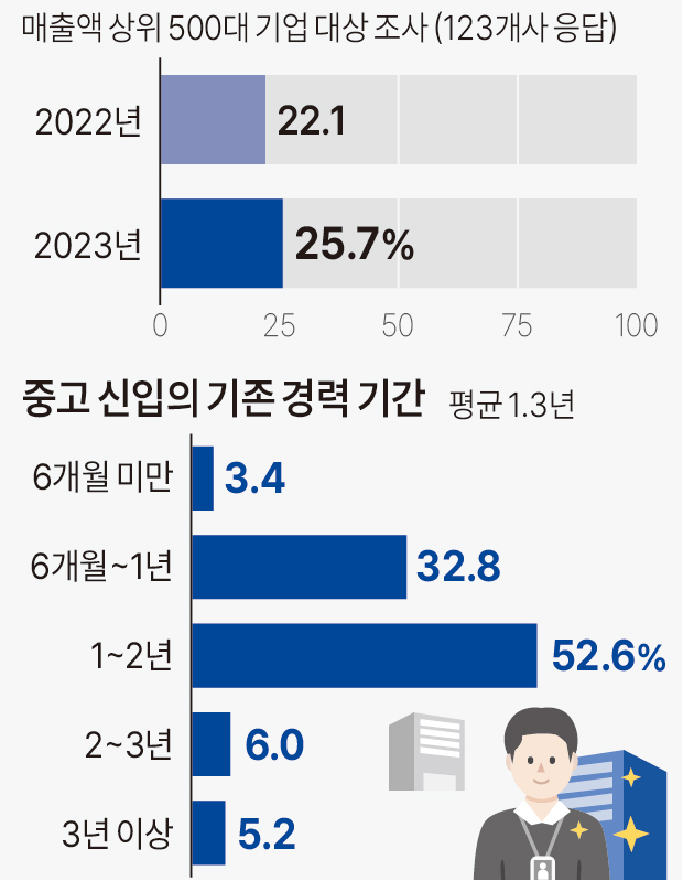 이는 2022년 대졸 신규입사자 중 중고신입 비중 22.1%보다도 3.6% 증가한 수준이다.
