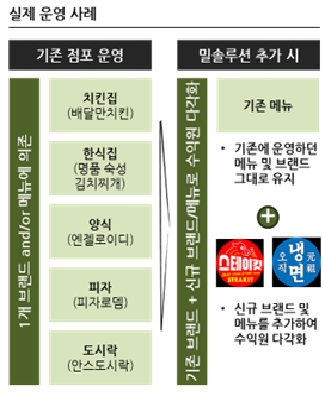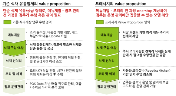 식당에 밀솔루션(Meal Solution) 접목으로 메뉴개발, 식재구입과 조달, 식재료 전처리, 조리의 전 과정을 One-Stop으로 제공하여 점주는 운영 관리에만 집중할 수 있는 모델을 구축한 것이다.