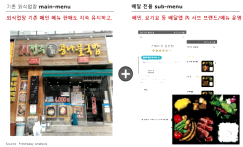 예를 들자면 저녁에는 치킨을 주 메뉴로 홀과 배달을 운영하고 점심 보조시간에는 육개장 또는 면 전문집으로 온라인상의 점포를 운영하는 것이다. 기 운영 중인 음식점의 주방 활용으로 별도의 투자 없이 매출을 발생할 수 있으므로 수익성을 극대화할 수 있다.