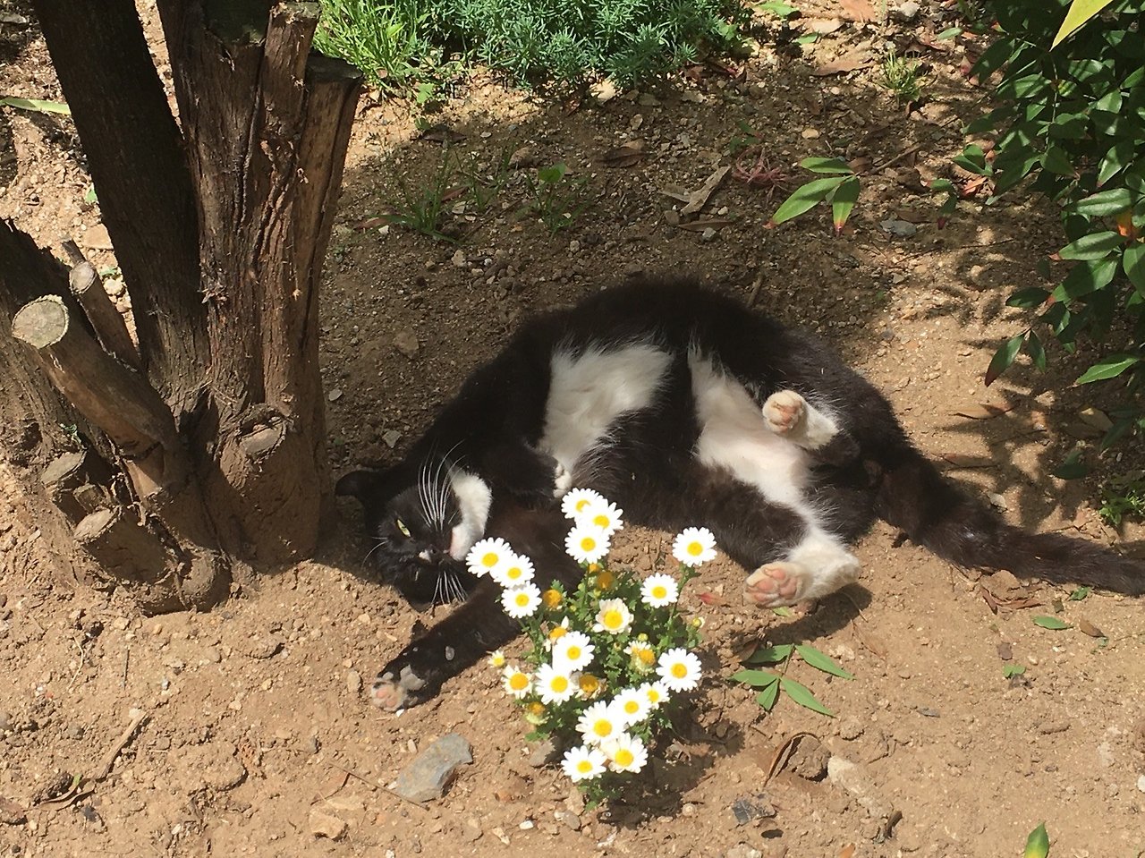 꽃 주변에 앉아있거나, 꽃향기를 맡거나 꽃 옆에서 논다.