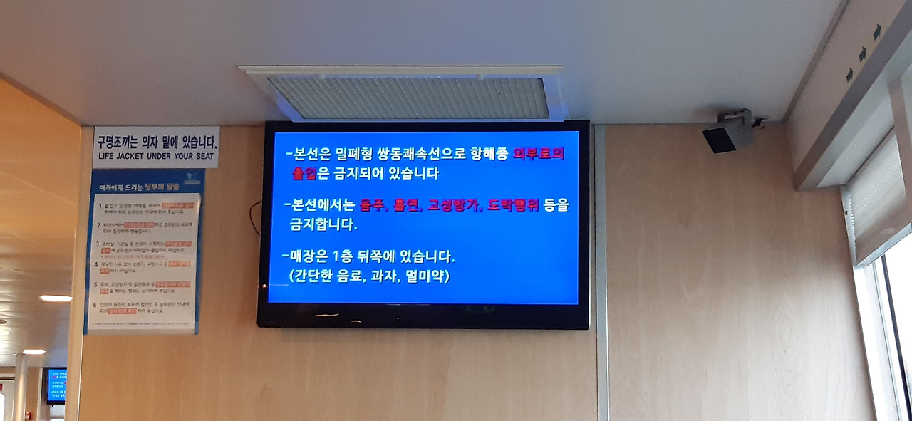 아 발권할 때 꼭 창가 자리로 요청해야겠다. 구명조끼 위치를 확인한다. 바로 의자 아래에 있다. 의자에는 목 받치는 부분이 없어 불편하다. 단체여행객들의 수다가 시작됐다. 그래도 마냥 즐거웠다. 울릉도에 가게 된다니!