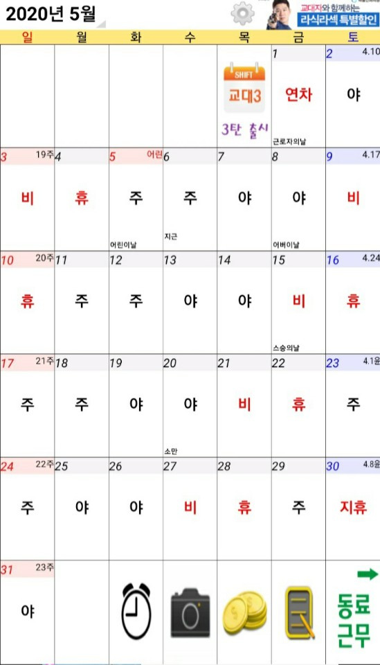 내가 근무한 교대 근무는 3조 2교대 근무와 4조 2교대 근무이다. 교대 근무도 회사마다 다르고, 조가 몇 개인지에 따라, 몇 교대인지에 따라 다르다. 그래서 같은 직장 사람이 아니면, 가족들도 친구들도 내가 어떤 근무인지 잘 이해하지 못한다. 그래서 항상 내가 이야기해주어야 한다. 보통은 핸드폰으로 교대 달력을 캡처해서 보내주며 ‘빨간 날은 쉰다고 생각하면 돼’, 라고 이야기하고 사전에 모임 약속을 잡는다.