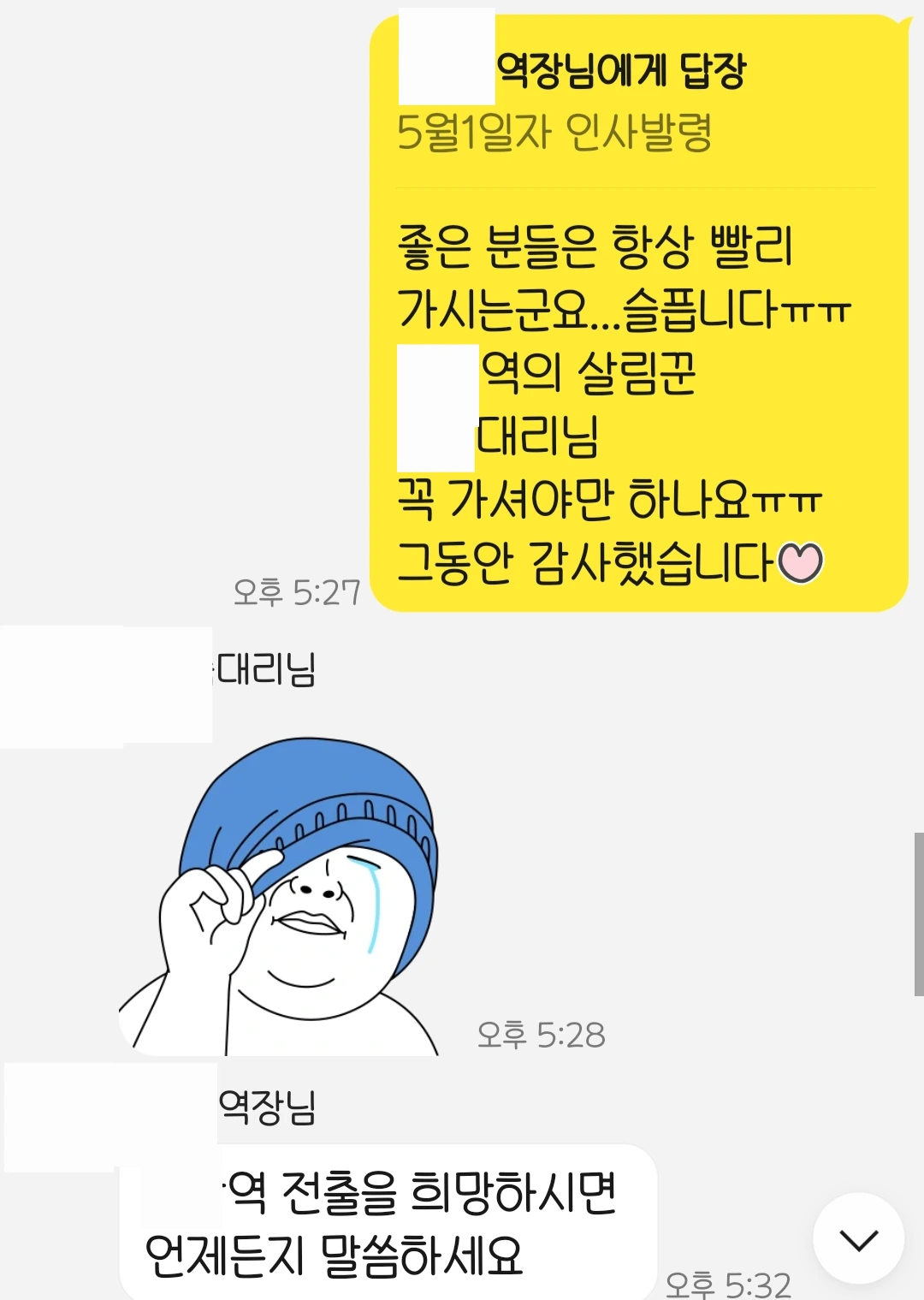 다른 직원분이 전출되어 아쉬움을 표시했다가 역장에게 전출하고 싶으면 말하라는 답을 받는 황당무계한 일을 겪었다. 직접 물어보니 자신이 인사발령 공문을 올린 것에 카톡 -답글-을 이용해서 아쉬움을 표한 나에게 서운했다고 한다. 다른 직원의 전출에 대해 슬픔과 감사를 표한 감사의 글을 어떻게 자신에 대한 위협과 서운함으로 해석할 수 있는지 기가 막혔다.