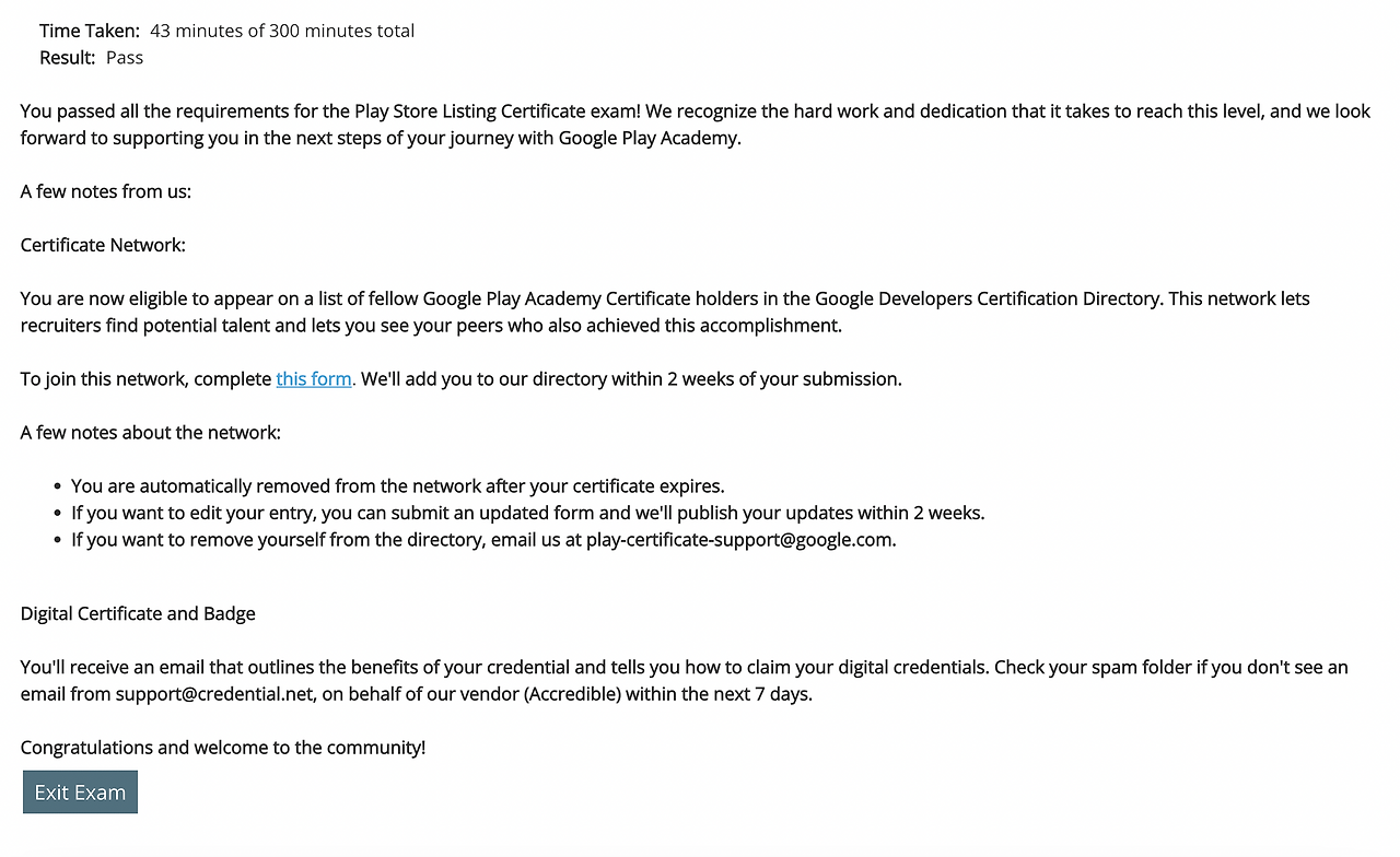 분명 들으면 실무에 도움이 될 것 같아 2주 주말동안 짬을 내서 들었고, 듣다 보니 시험도 치게 되었고, 68문제를 풀고나니 Google Play 아카데미 디렉토리에도 등록되게 되었다. 인증서의 유효기간은 2년.