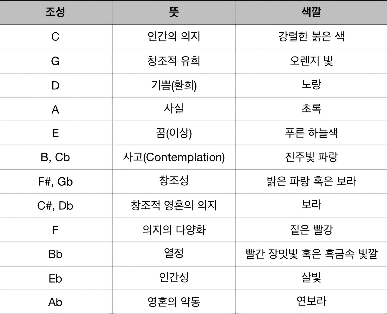이건 스크리아빈(A. Scriabin)의 공감각적 사고에서 나온 건반들의 색채로, 그는 건반(음)마다 고유의 색깔이 있다고 생각하였다. 이 색채 음악을 따른다는 가정하에, 위에서 말한 화와 곡집에 해당하는 색깔에 대응하는 음을 찾아보면 각각 도, 솔, 시♭이다.