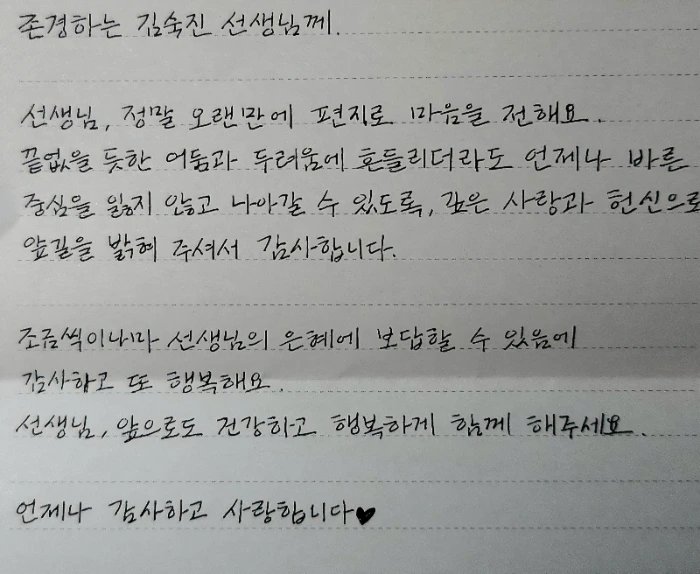 "소중한 우리 아이들, 올 한 해도 정말 고생 많았어요. 마음이 가벼운 날도 있었고, 무거운 날도 있었겠지만 그 모든 시간이 여러분을 조금 더 단단하고, 속 깊은 사람으로 만들어 주었을 거라 믿어요. 다가오는 새해에는 조금 더 웃고, 조금 덜 아파하고, 조금 더 자신을 아끼며 살아가길 바랍니다. 어디에서 무엇을 하든, 여러분의 편이 되어 주는 어른들이 이 세상 어딘가에 꼭 있다는 것, 잊지 말아 주세요~!"