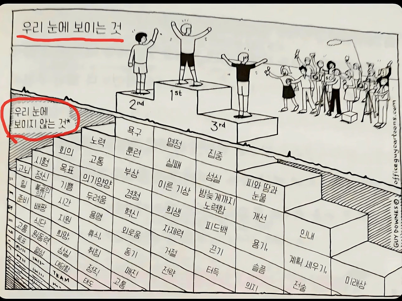 우리는 눈에 보이는 결과만을 말한다. 그러나 그 결과를 떠받치고 있는 것은 克己(극기)로 이겨낸 날들과 다시 일어선 순간들, 말없이 버텨낸 시간들이다. 대부분 눈에 보이지 않는 것들이 우리의 삶을 더 많이 결정한다.