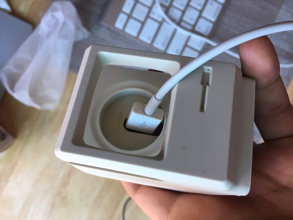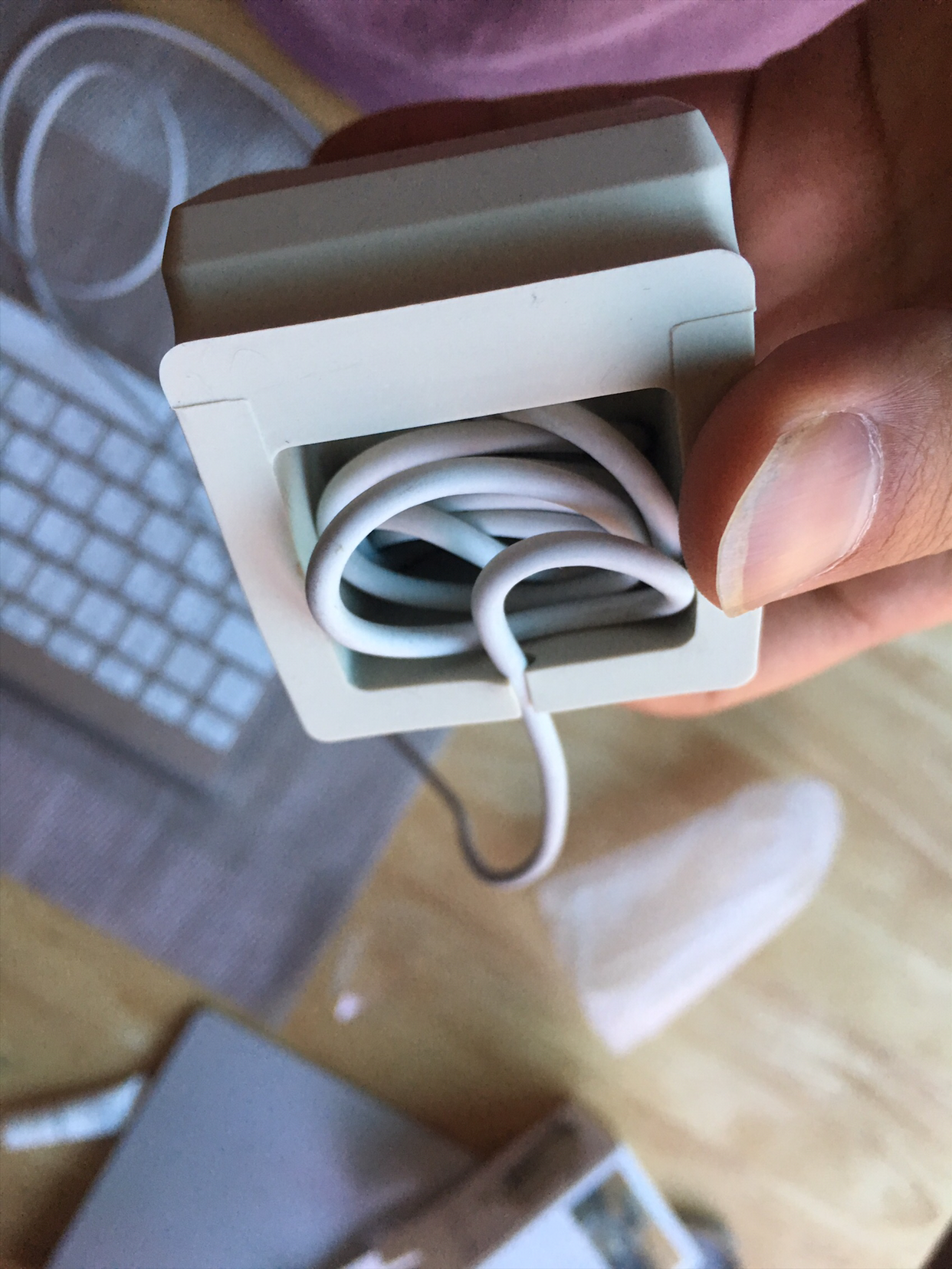 설명서가 없어서 이걸 어떻게 충전기랑 넣을까 고민하다가 나는 원래 이런거 잘 못하는데 애플모양새를 하고 있어서인지 번뜩!!! 거꾸로 집어넣고 왠지 하단부에 공간이 있어 길게 만들어진 충전기 줄을 구겨 넣었다