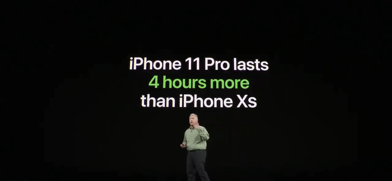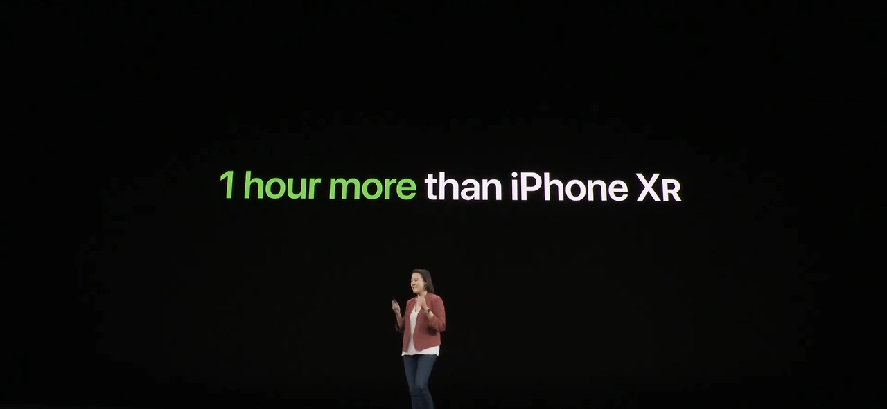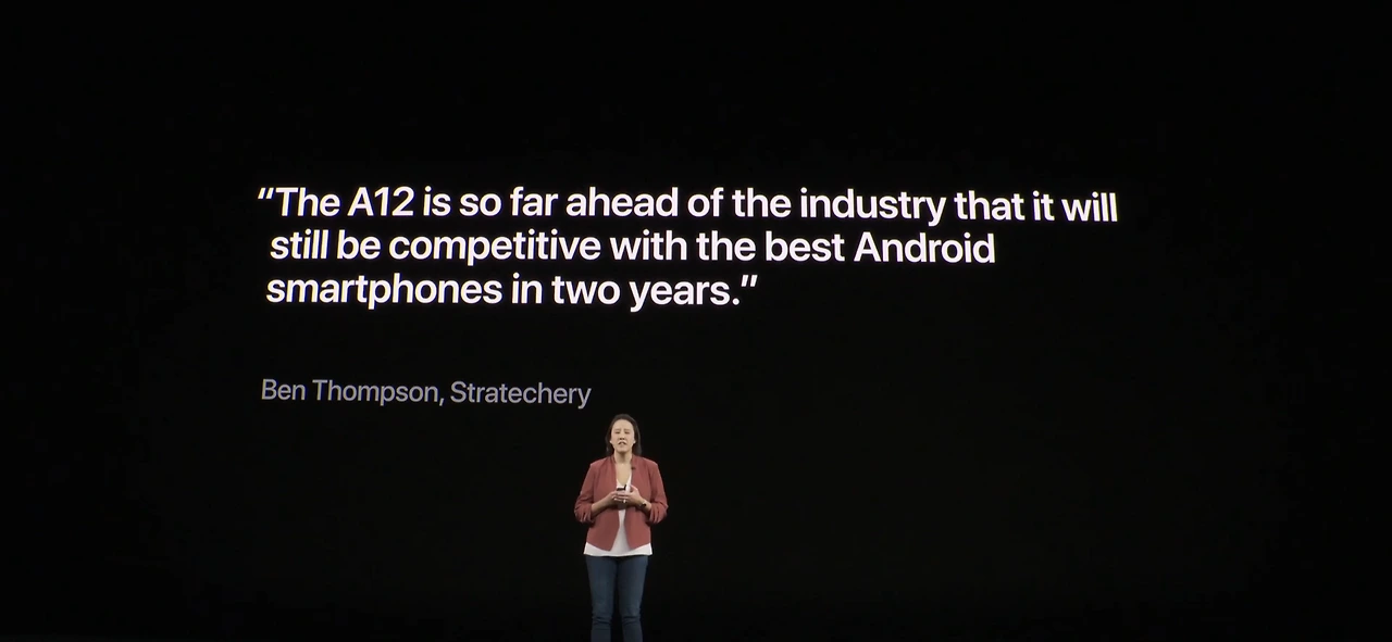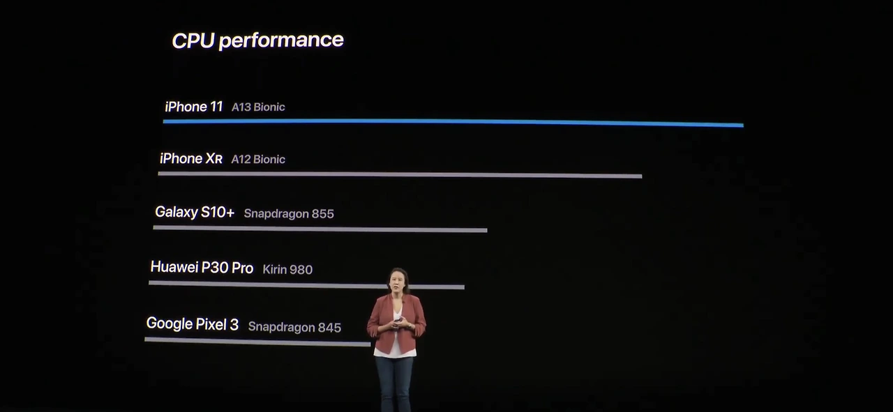 요즘 신제품 프레젠테이션을 보면 타사 제품의 성능을 아예 대놓고 비교하는 장면이 많이 나오는데, 이번 애플 프레젠테이션에서도 등장했다. 신제품들 속에서 아이폰이 단연 압도적인 포퍼먼스를 보여준다는 그래프다.