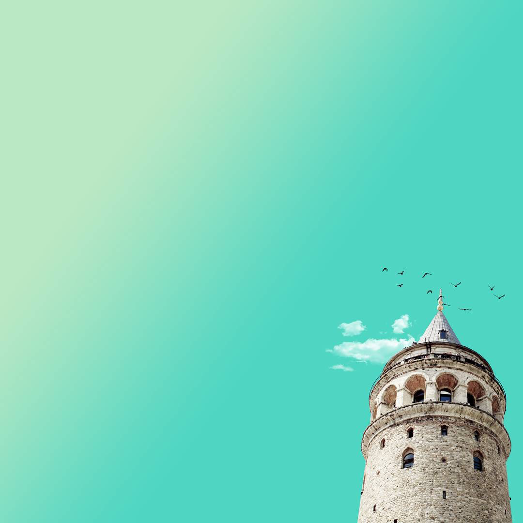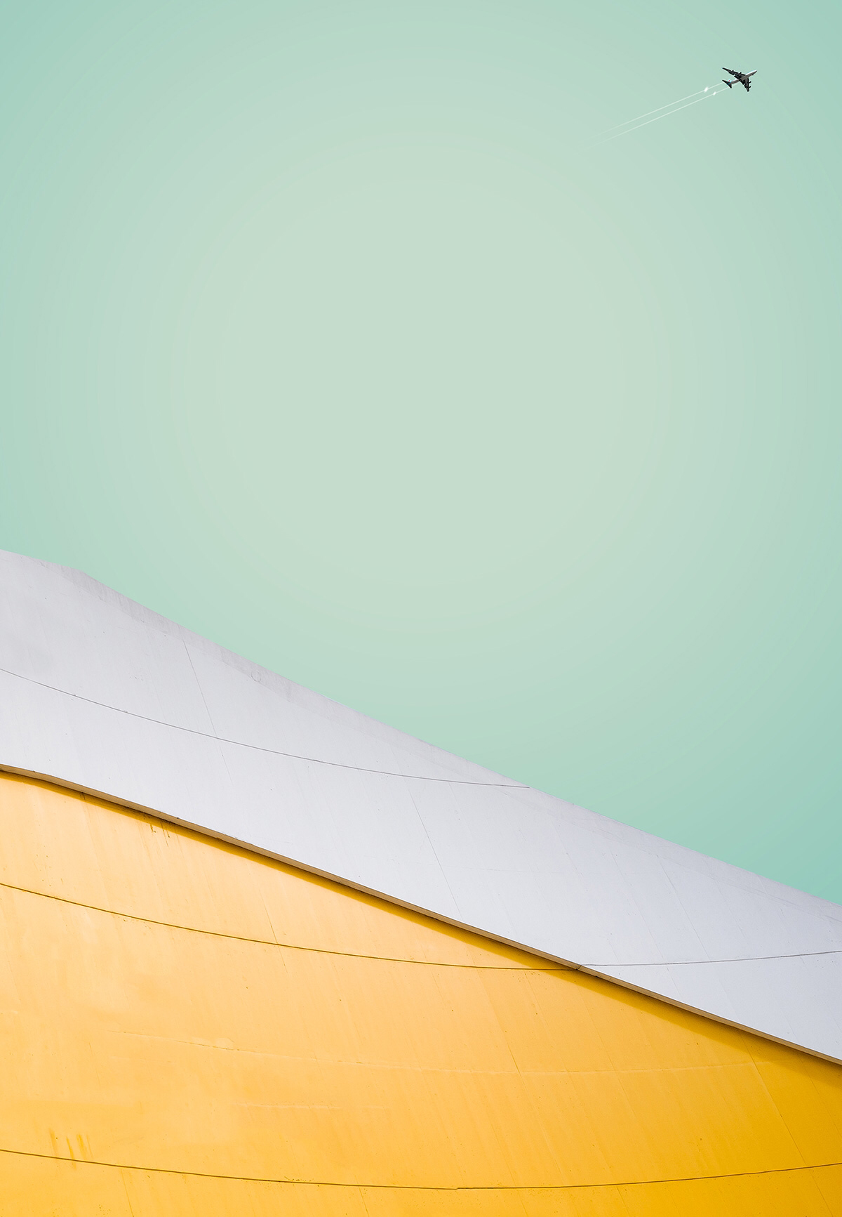 청록색과 하늘색 그라디언트를 자연스럽게 연출하여 하늘, 땅, 건축물과 조화시켜 차분하고 미니멀한 이미지를 만들어 내고 있다.