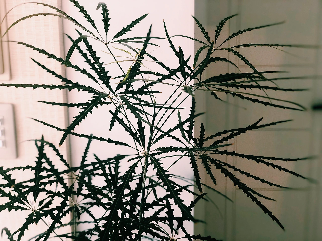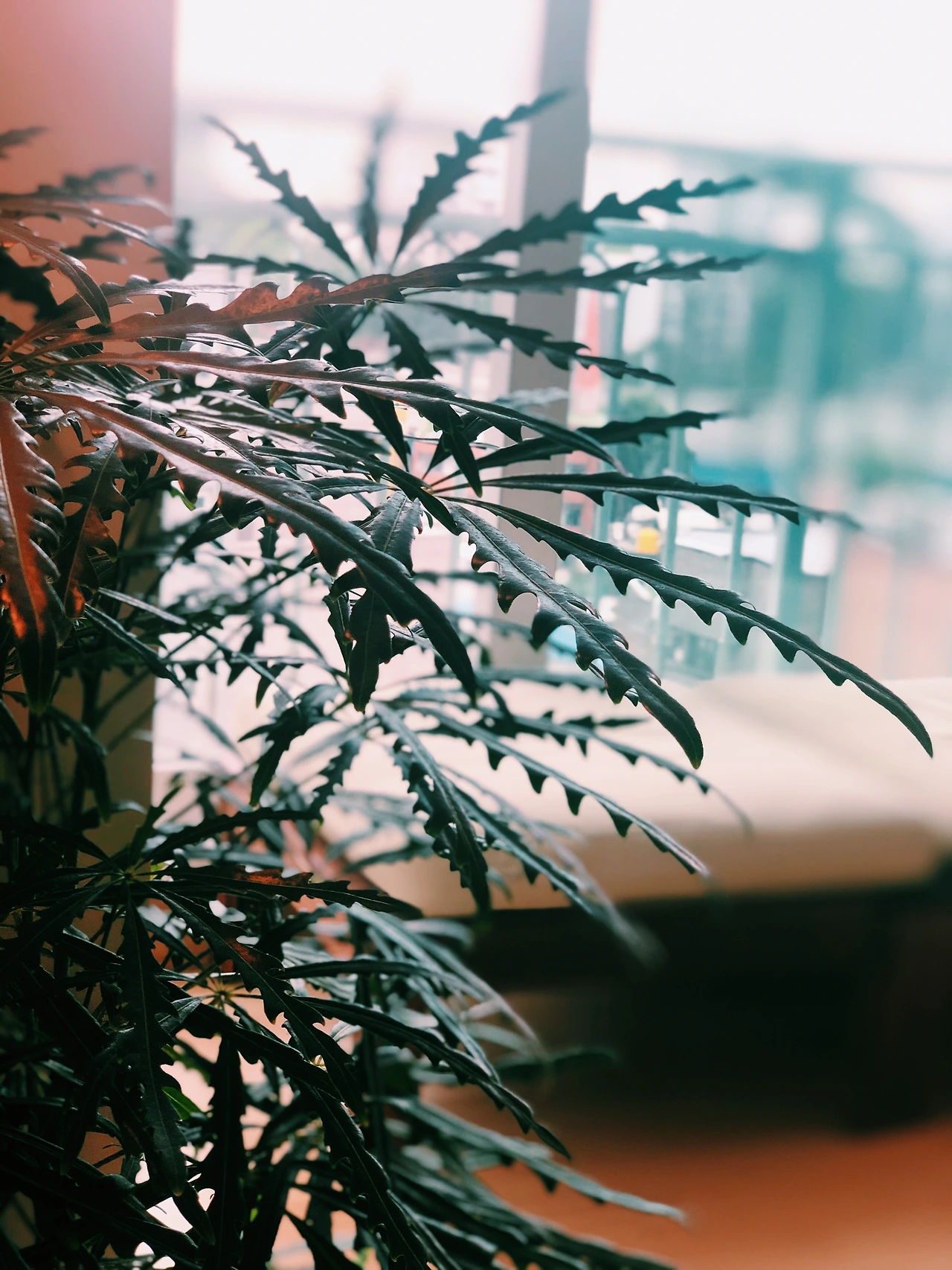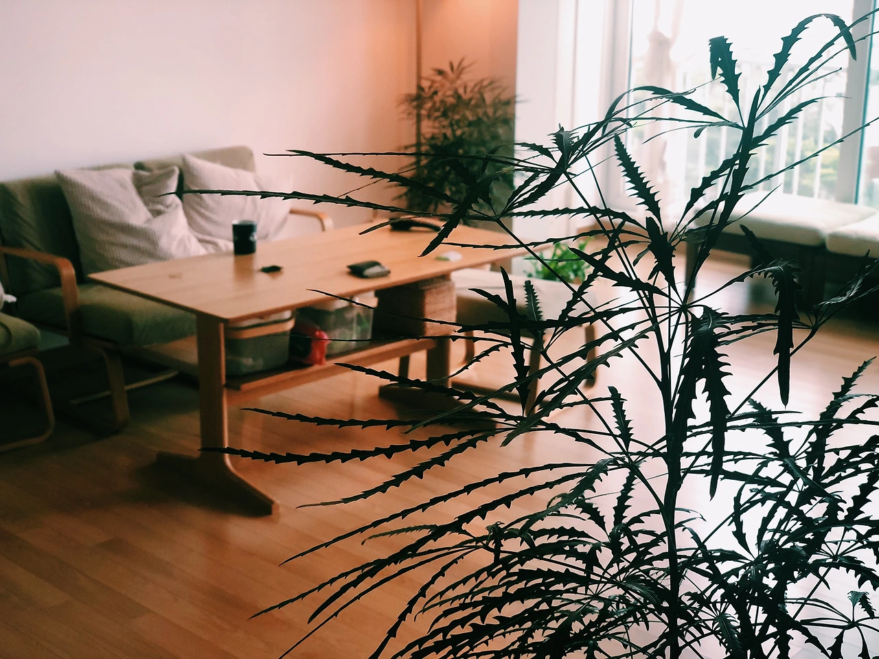 그리고 대망의 거실에 놓아둔 '알랄리아'라는 녀석, 양재 꽃시장 갔다가 바로 한눈에 들어온 나무다. 잎 컬러가 두 종류가 있는데 완전 레알 포레스트 그린 컬러랑 그린 컬러 두 종류가 있었다. 어떤 걸 살지 고민하다가 그냥 두 녀석을 다 데리고 왔다. 잎이 정말 이쁘고, 그림자가 지면 진짜 더 멋지다. 역시나 명품 매장에 들어가는 나무라고 한다. 아랄리아 역시 양지 식물이며, 1주일에 한 번씩 물을 주면 위로 자란다.