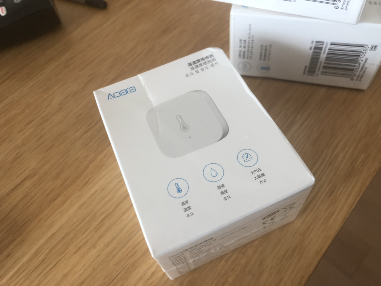 이 녀석은 온도와 습도 고도를 측정한다. 홈킷에 연결되면 온도와 습도를 체크 (아카라 앱에서 고도 확인 가능) 한다. 나는 방방마다 붙여놓았다가, 세 개가 모두 비슷한 습도와 온도를 보여 한 개는 베란다에 설치, 나머지는 거실, 침실에 설치하였다.