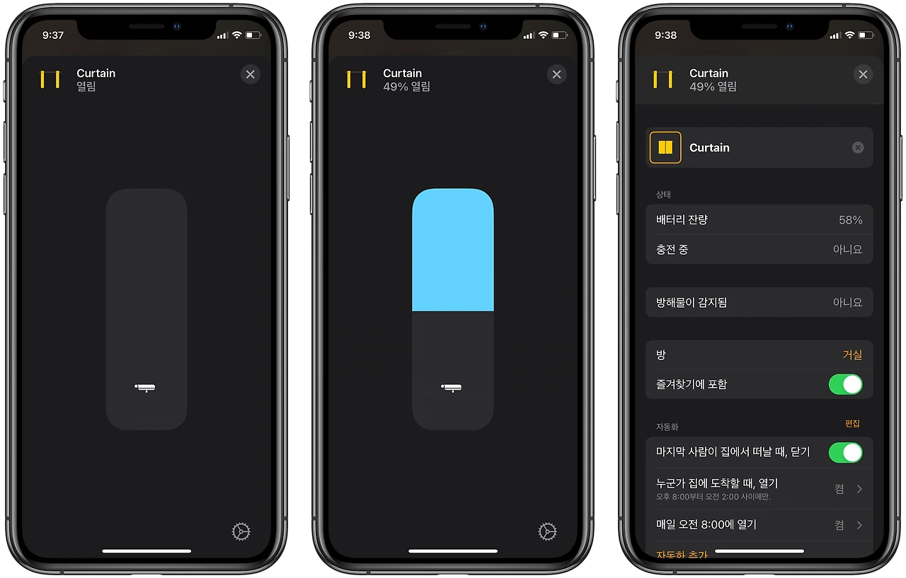 홈 앱을 활용하여, 열림 상태를 %로 컨트롤할 수도 있다.