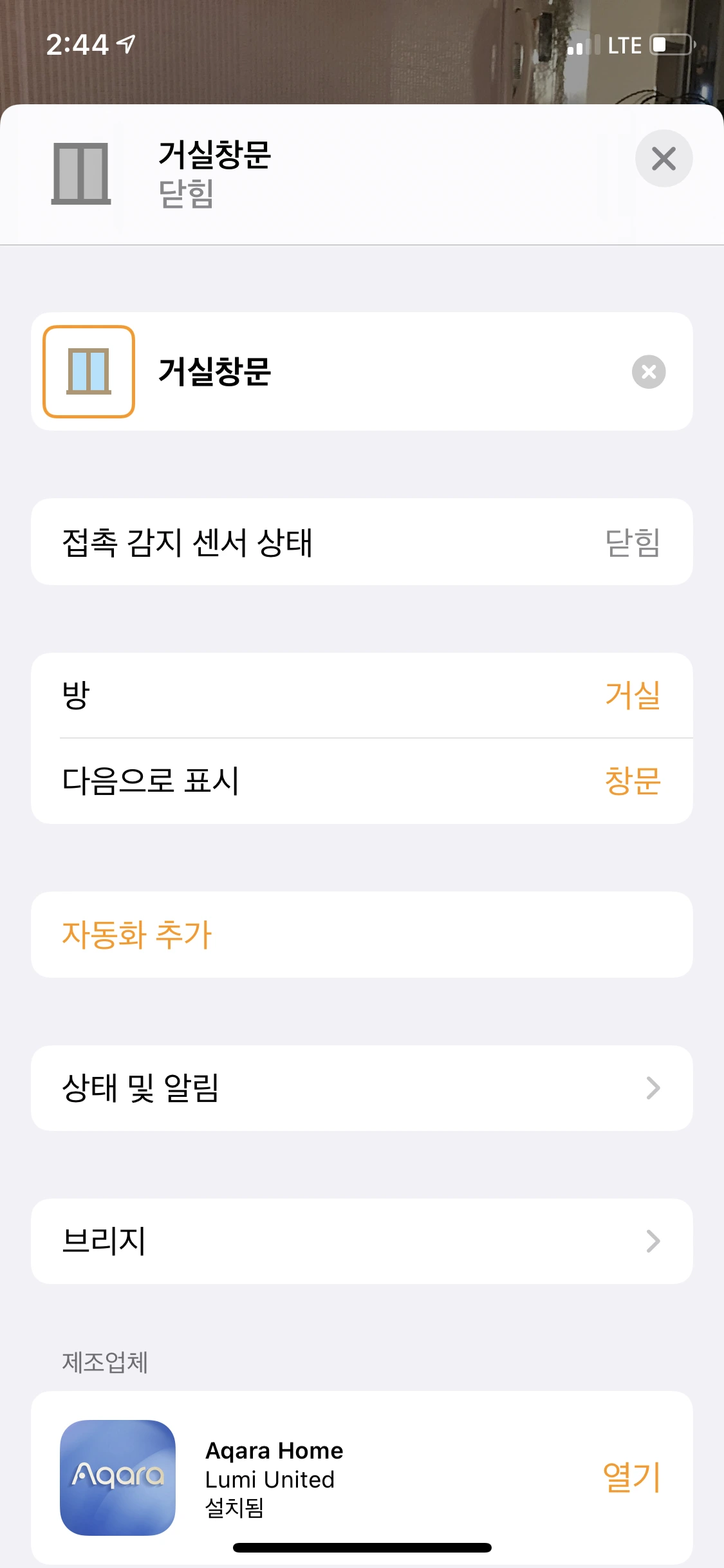 - aqara 문열림 센서 2개 (현관문, 거실 창문)