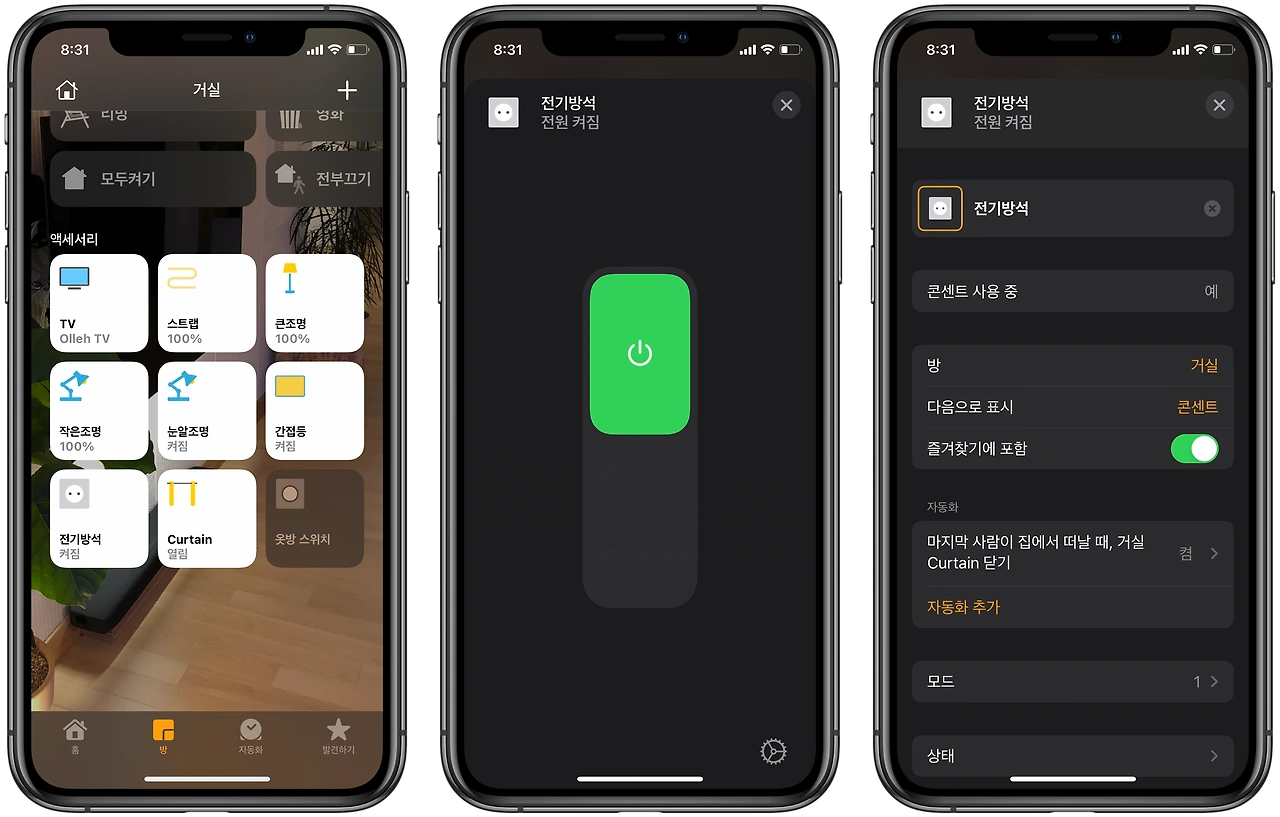 설정을 통해서, 자동화 모드도 설정이 가능해서, 자기 전에 '모두 끄기'를 선택하면 전기장판을 일일이 끌 필요도 없이 자동으로 꺼진다. 그리고 원거리에서 깜빡하고 끄지 않았을 경우에도 아이폰 홈 앱에 접근해서 on/off를 할 수 있다.