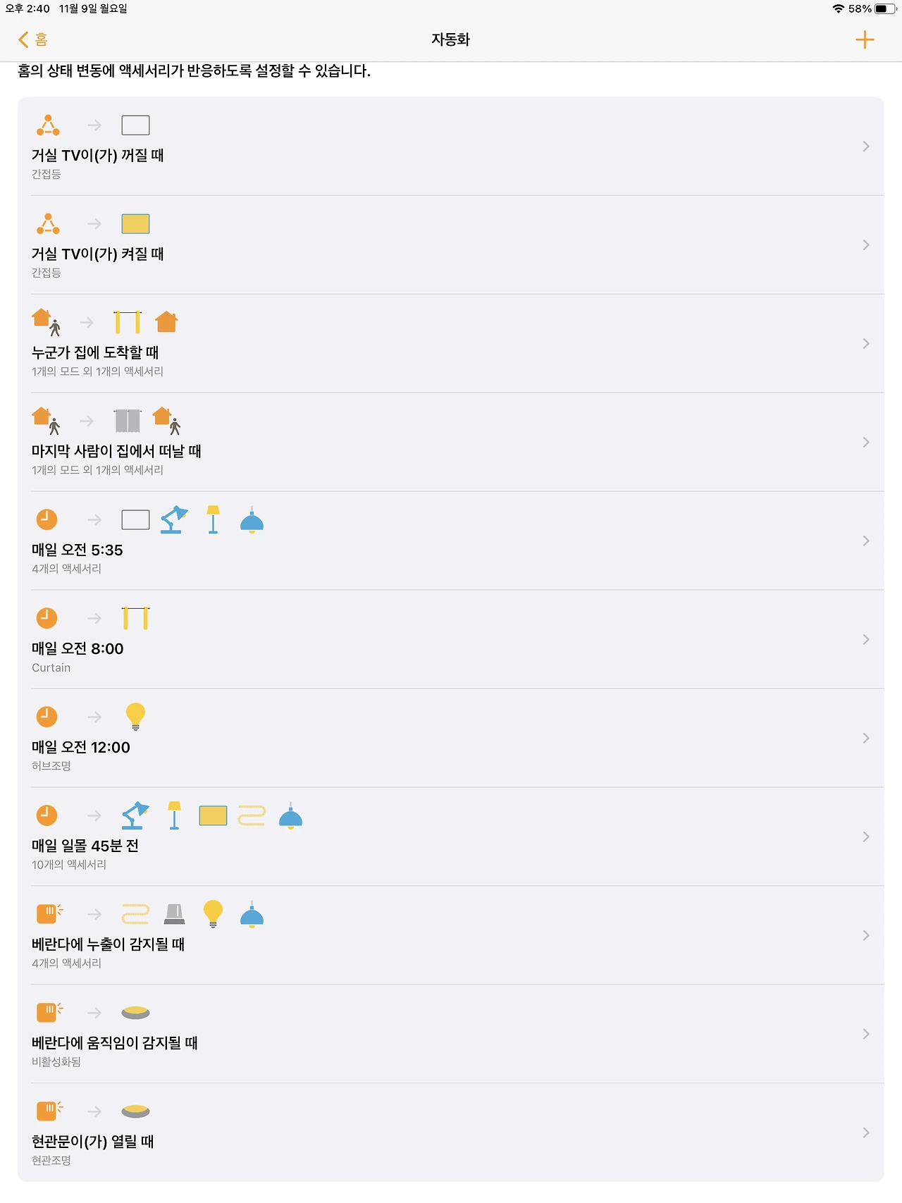 예를 들어, 누군가 집에 오면 전부 켜기 모드 실행이 가능하고(홈킷에서 사용자 위치를 확인한다. 집에 누군가 있을 때, 없을 때도 구분이 가능하다), 일몰 1시간 전에 전부 켜기 모드 작동, 현관문이 열리면 현관 조명 켜지기, 텔레비전이 켜질 때(우리 집은 webOS4.5 텔레비전이라 홈킷과 연동) 텔레비전 간접조명 켜기 등이 가능하다.