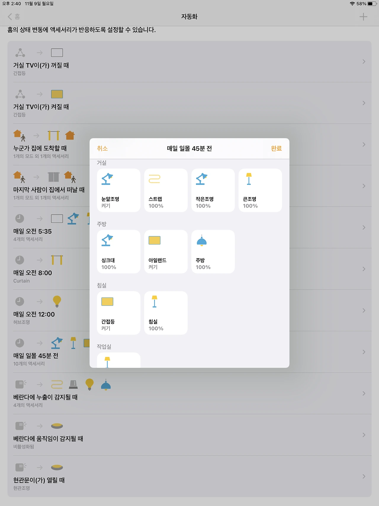 홈킷 내 자동화는, 내가 원하는 시간, 사용자를 구분하여 자동으로 모드나 액세서리들이 온오프 되도록 설정할 수 있다.