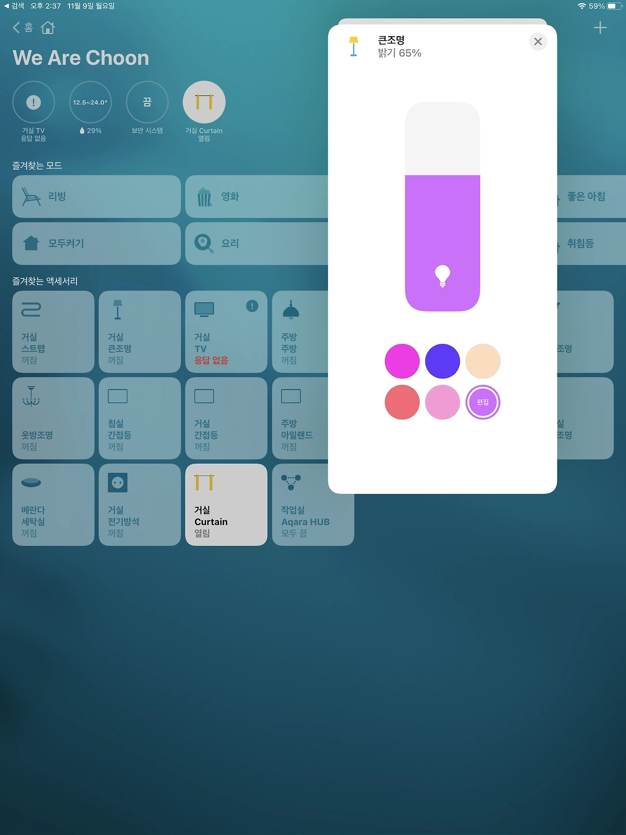 휴식모드 - 거실 외 조명을 모두 끄고, 거실 조명은 북극의 오로라(?)를 모티브로 아주 릴랙스 하고 싶은 컬러로 변경한다.