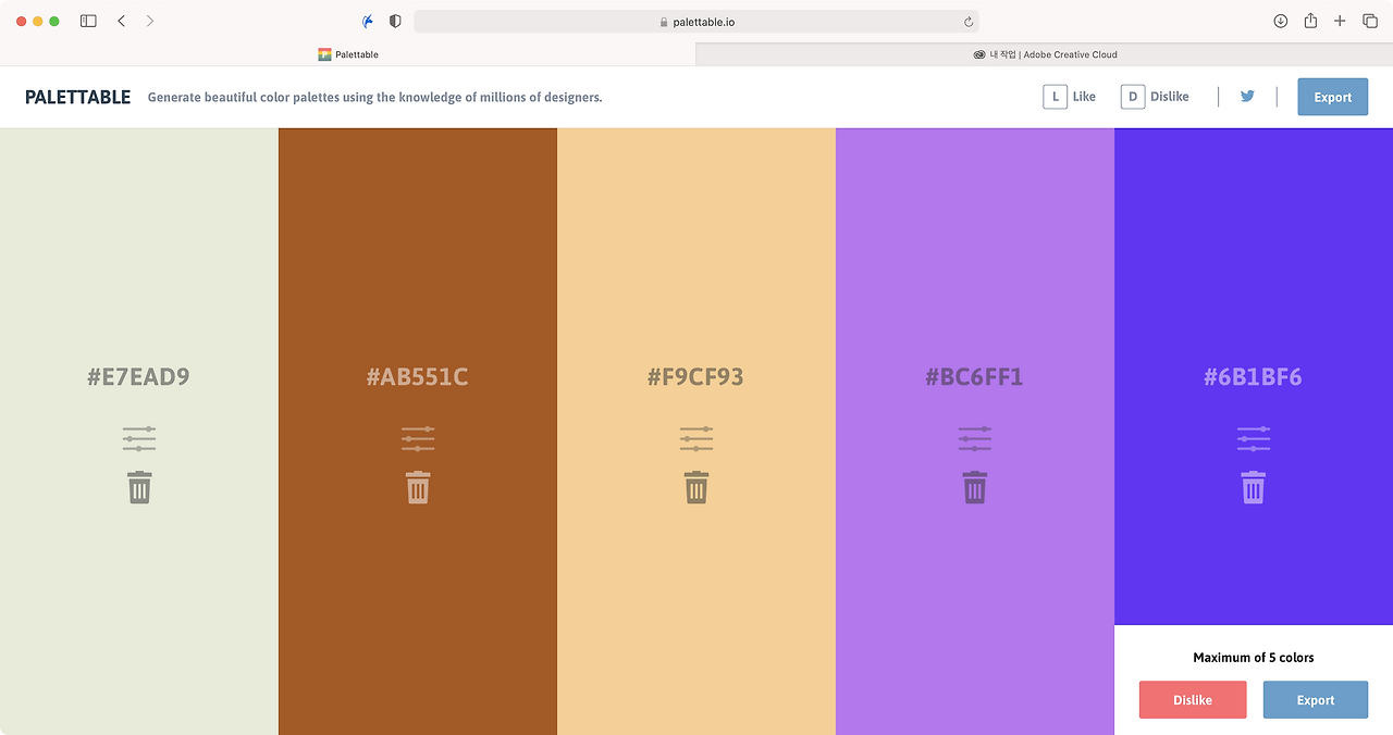 제시된 컬러의 선호 유무를 좋아요, 싫어요를 통해 총 5가지의 컬러코드를 추천합니다. 5가지가 모두 완성되면 PNG형태로 내려받을 수 있습니다.