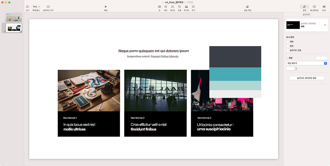이미지를 다운로드한 후, 키노트에 이미지를 불러와 컬러 창의 스포이드를 이용해 컬러를 쉽게 바꿀 수 있습니다.