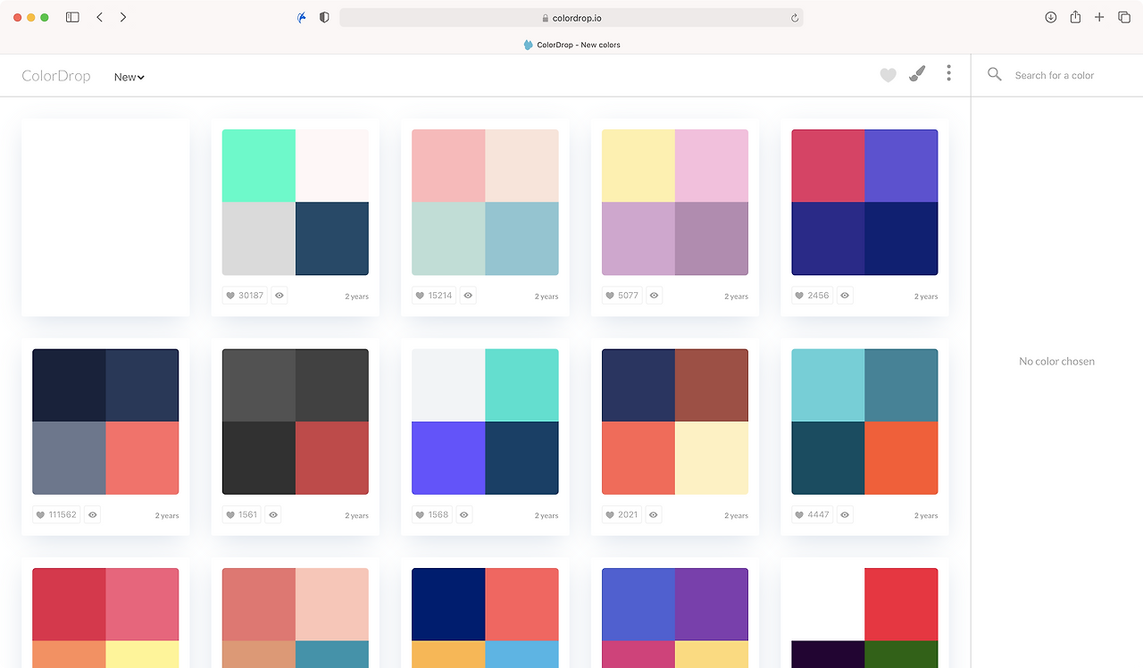 4가지의 컬러를 하나로 묶은 팔레트를 랜덤으로 추천해 줍니다. 계속해서 업데이트가 되고 좌상단 필터를 통해 가장 많이 다운로드된 컬러 순으로 정렬할 수 있습니다.