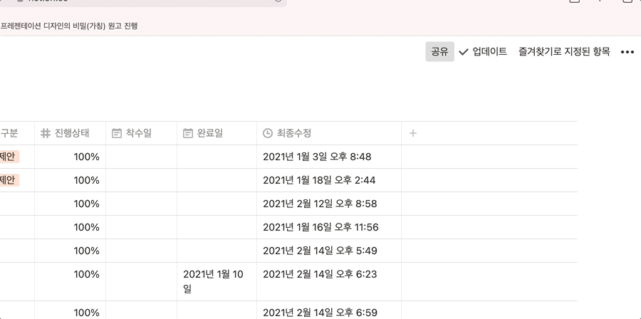 나만의 문서공간을 만들 수 있다. 언제 내가 이 주제를 쓰기 시작했는지 '착수일'을 지정하도록 할 수 있고, 언제 '완료'를 했는지 날짜를 체크할 수 있다. 또한 최종 수정일 지정을 통해, 어느 문서가 최신화가 가장 늦게 되었는지, 지연되는지를 한눈에 파악해볼 수 있다.