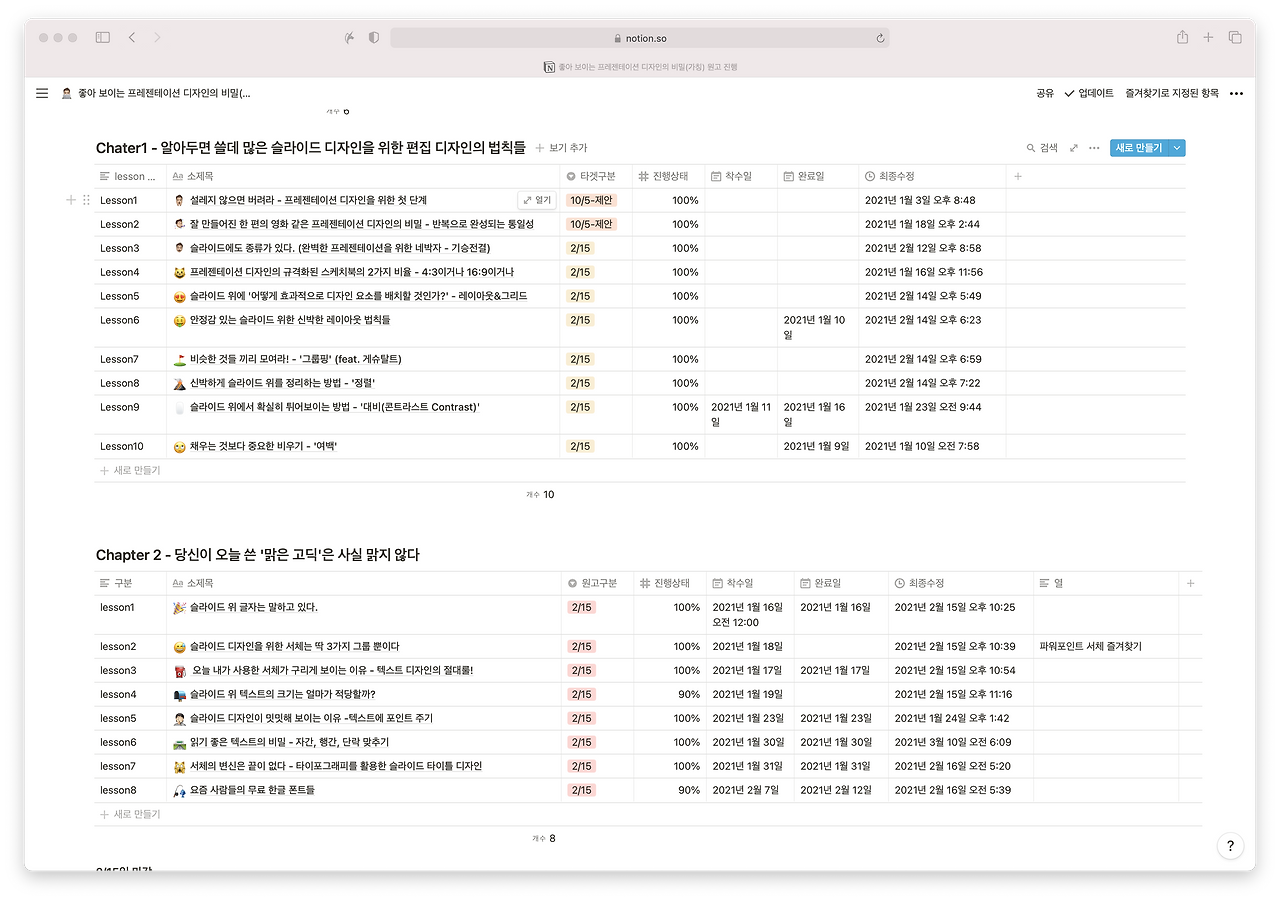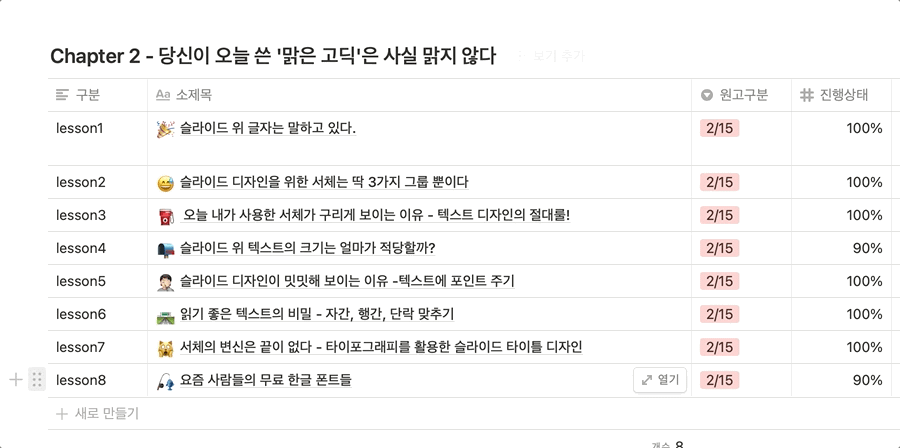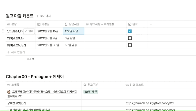 책은 구조 정리의 싸움이다. 예를 들어 챕터 1에 있던 내용이 챕터 3으로 이동해야 하는 경우가 많은데, 이럴 때는 그냥 표에서 드래그하여 이동만 하면 된다. 머릿속에 생각한 데로 바로바로 구현이 가능한 것 이것이 노션의 장점이다.