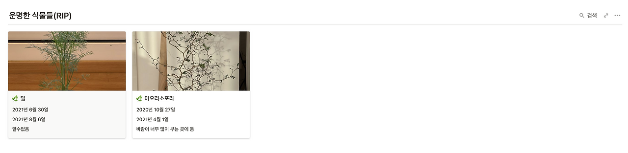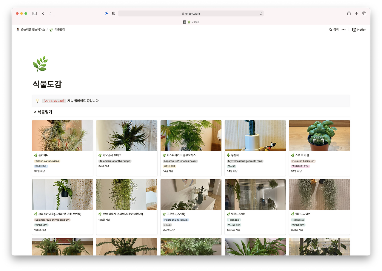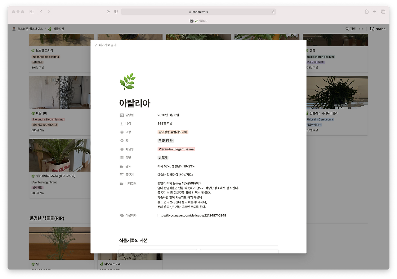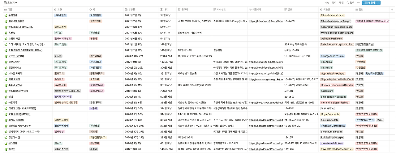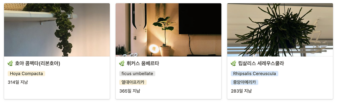 2020년 옛날보다 넓은 집으로 오면서 이상한 취미가 하나 생겼다. 바로 식물 키우기... (갑자기 왜 식물을 키우게 되었는지는 예전 포스팅을 참고해보면 됨) 부쩍 늘어난 식물들을 보면서 누가 누군지도 모르겠고, 어떤 애는 매일매일 성장하는 게 눈에 보이니, 이거 어디인가에 기록을 해두고 싶었다. 그래서 생각해낸 게 노션!!