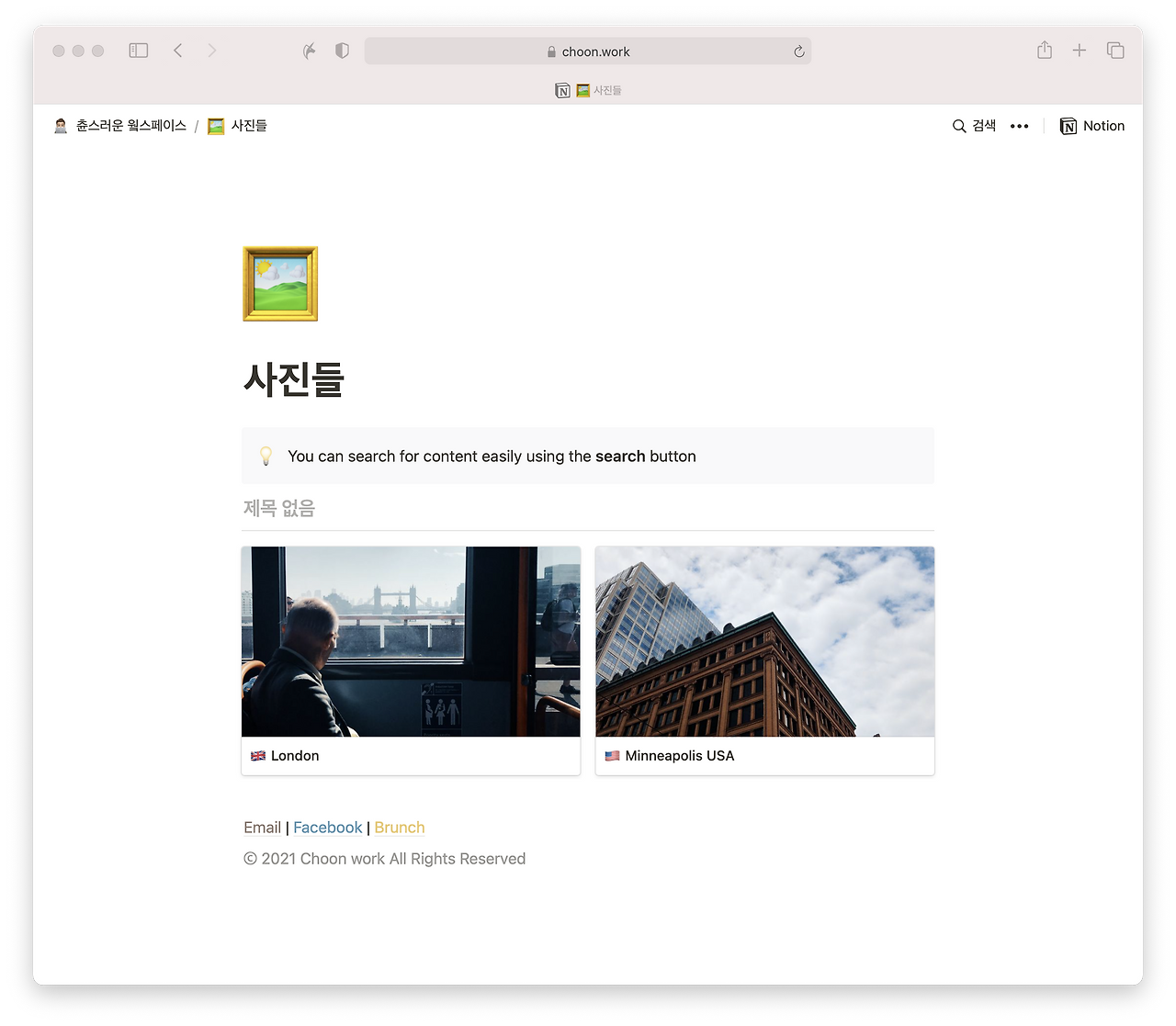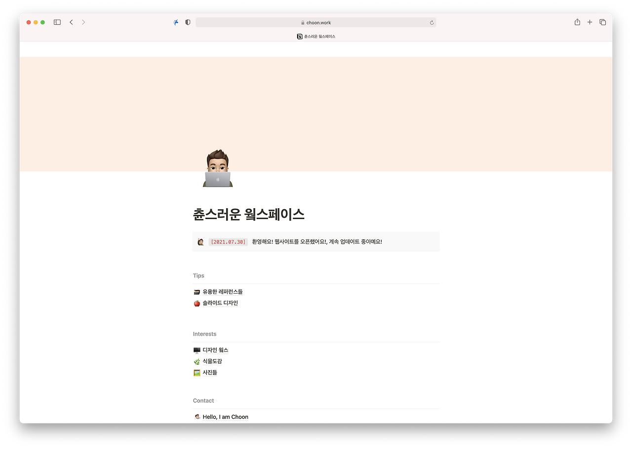 노션으로 홈페이지를 만들었는데, 뭔가 좀 있어빌리티 하게 보이게 하기 위해서 나는 노션에 도메인을 연결해 보았다. 여러 가지로 고민하다가 촌스러운 워크스페이스의 약자인 '츈웍'을 이용하여 choon.work(연간 유지비 9,800원)라는 도메인을 연결하였다. (노션과 도메인 연결 방법은 인터넷에서 쉽게 찾을 수 있으므로 생략)