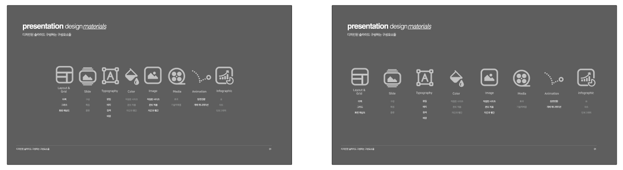 좌측의 슬라이드는 한 장의 슬라이드 속에 엄청 많은 양의 디자인 요소들과 정보가 들어가 있고, 우측 슬라이드에는 좌측보다 디자인 요소와 정보가 적고 깔끔한 레이아웃이 적용되어 있습니다. 두 장의 슬라이드 중에 어떤 슬라이드가 더욱 여유롭게 보이시나요?