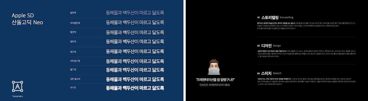 맥킨토시 사용자라면 기본으로 설치된 '애플 산돌 네오고딕'도 괜찮은 서체입니다. 애플이 기존에 사용하던 한글 서체인 '애플고딕'의 문제점을 보완하고자 산돌커뮤니케이션과 협업하여 2012년 OS X 마운틴 라이언, iOS5.1에 탑재되기 시작한 서체입니다. 가독성이 좋고 유행을 타지 않는 디자인을 하고 있어 슬라이드 디자인의 본문 서체로 무난히 사용할 수 있습니다. 애플 제품에 탑재된 애플 산돌 고딕 네오의 라이선스는 모두 애플이 가지고 있고, 애플 제품을 사용하는 사용자에 한해 비상업, 상업 용도로 모두 사용이 가능합니다. 애플 산돌 고딕 네오는 얇은 체, 일반체, 야주 옅은 체, 옅은 체, 중간체, 세미 볼드체, 볼드체, 강한 볼드체, 무거운 체의 무려 9가지의 굵기를 제공하고 있습니다.