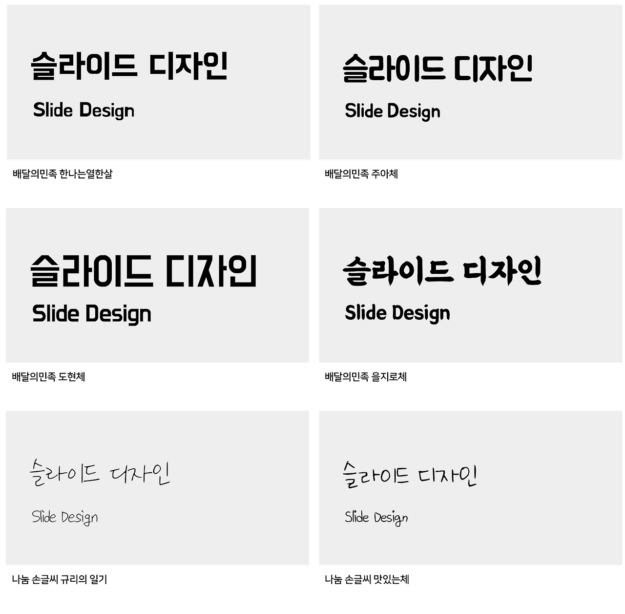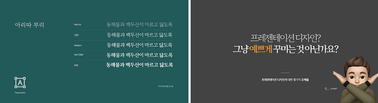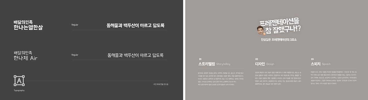 배달의 민족으로 유명한 우아한 형제들은 2012년부터 한글날에 맞추어 다양한 무료 한글 서체들을 배포하고 있습니다. 주로 제목용, 키워드용 서체로 적합한 서체들이 많이 있고 '배달의민족 한나체 air'의 경우 다소 굵은 '한나는 열한 살 체'를 기준으로 본문용으로 사용할 수 있도록 리 디자인한 서체들도 있습니다. 배달의민족의 서체를 잘 활용하면 트렌디해 보이는 슬라이드를 디자인할 수 있습니다.