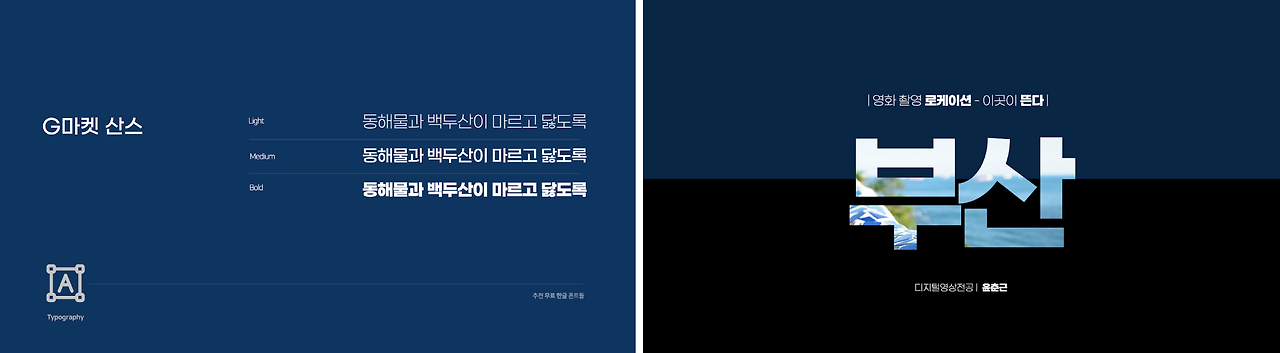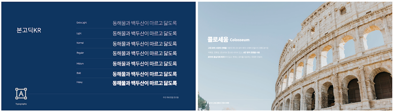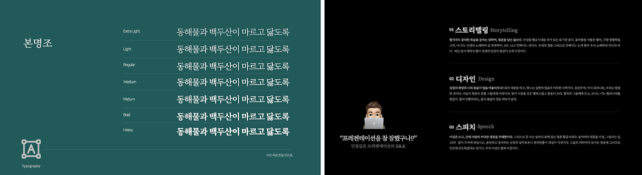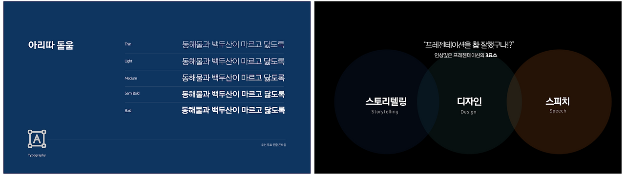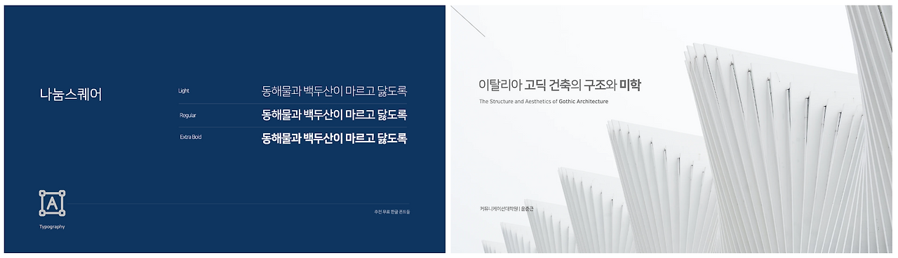 옛날(?)에는 프레젠테이션 디자인에서 사용할 가독성 좋은 서체를 소유하는 것은 매우 어려운 일이었습니다. 프레젠테이션 툴을 설치하면 기본으로 설치되는 서체들 중에서만 골라야만 해서 자간을 조절하는 것 외에는 별다른 옵션이 없었기 때문입니다. 또한 기본으로 탑재된 서체들의 완성도가 좋지 못하여 쓸만한 서체들이 거의 없었습니다. 기본 서체를 선택하는 게 아니라면 폰트를 제작하는 업체에 돈을 지불하고 서체 라이선스를 구매하여 사용해야 했는데, (당시에는 학생이라..) 비상업적인 용도로 프레젠테이션을 만드는 경우가 많았는데 가격이 비싸 굳이 이렇게 돈을 내면서까지 디자인을 해야 할까?라는 고민이 있었습니다.