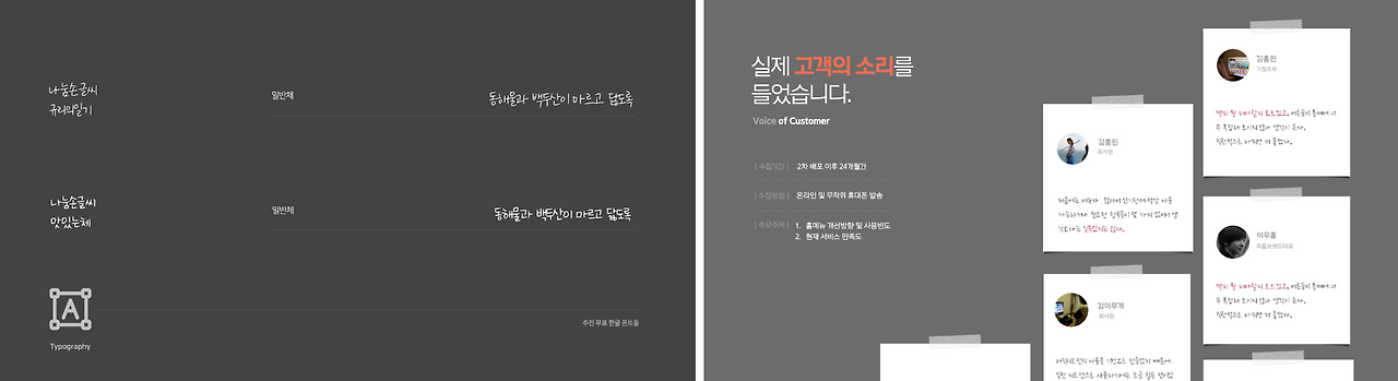 본문 슬라이드 내에서 콘셉트 적으로 사용된 나눔 손글씨 캘리그래피 그룹의 서체는 가독성이 떨어지므로 본문 서체로는 적합하지 않으며, 예시 이미지처럼 콘셉트적(포스트잇 콘셉트)으로 활용되어 디자인적 요소로 사용될 수 있습니다.