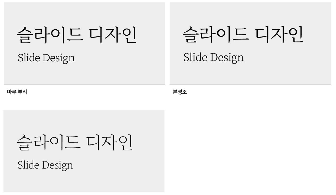 슬라이드 디자인에서 명조 그룹의 서체들은 고딕 그룹의 서체에 비해 덜 사용되기는 하지만, 명조 그룹의 특성을 잘 파악해두고 자주 사용하는 명조 서체의 특징을 미리 알아두면 적재적소에 빠르게 사용할 수 있습니다.
