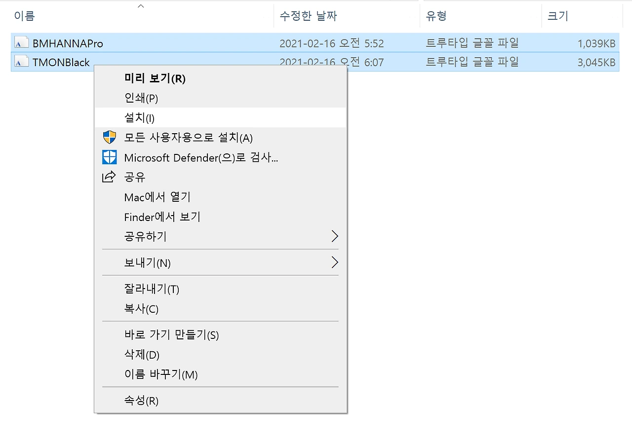 2. 글꼴이 여러 개인 경우 드래그한 후 오른쪽 마우스를 누른 후 [설치]에서 한꺼번에 서체를 설치할 수 있습니다.