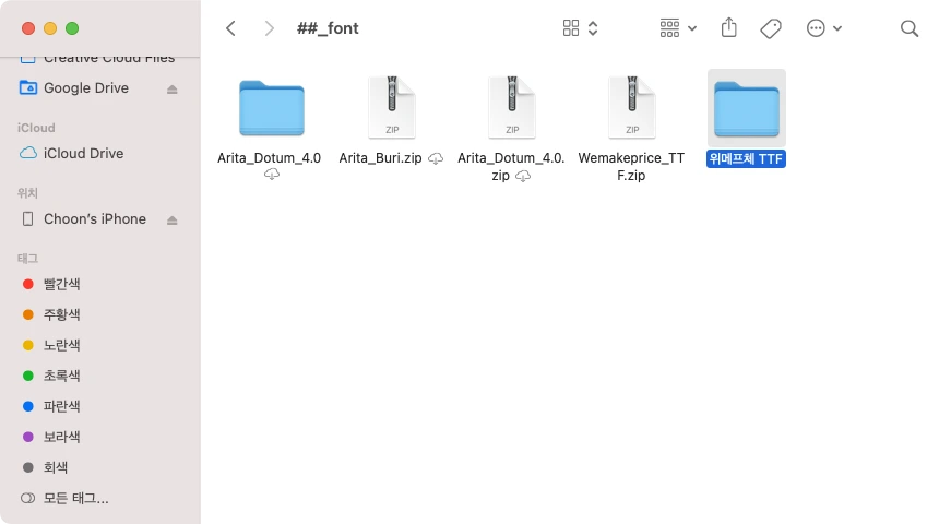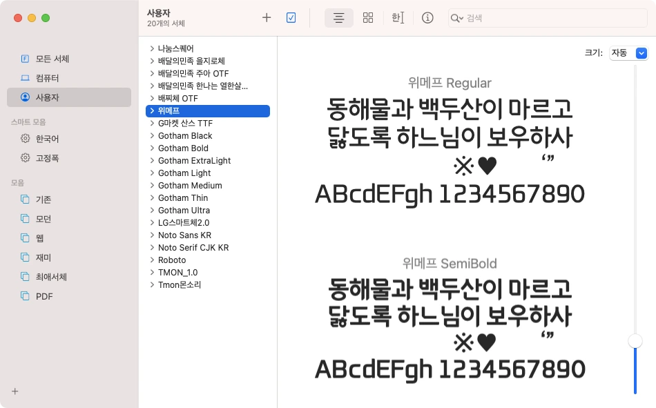 5. 설치된 서체 확인하려면 [finder] [응용프로그램] [서체 관리자]를 선택하여 [사용자] 탭에서 방금 설치한 서체를 확인할 수 있습니다.
