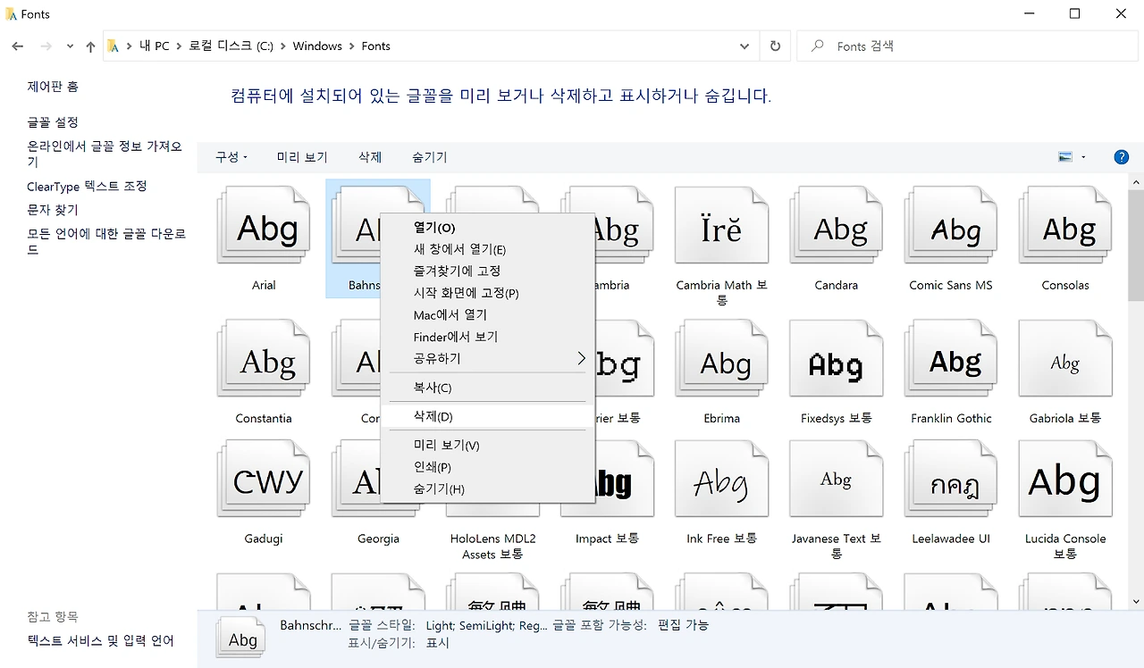 3. 서체를 삭제하려면 [c:] [windows][font]에서 삭제하려고 하는 서체를 선택 후 오른쪽 마우스를 누른 후 [삭제]를 통해 삭제합니다.