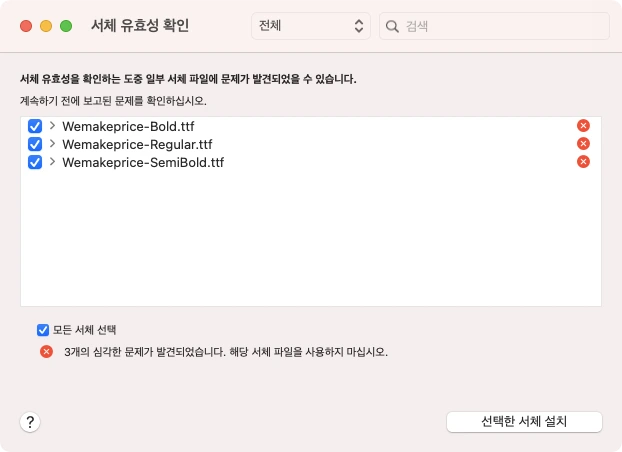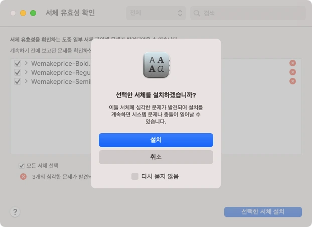4. 서체 유효성을 확인합니다. 설치할 서체에 체크박스를 해주고 하단의 [선택한 서체 설치]를 눌러줍니다. 팝업창이 뜨면 [설치] 버튼을 눌러 설치를 마무리합니다.
