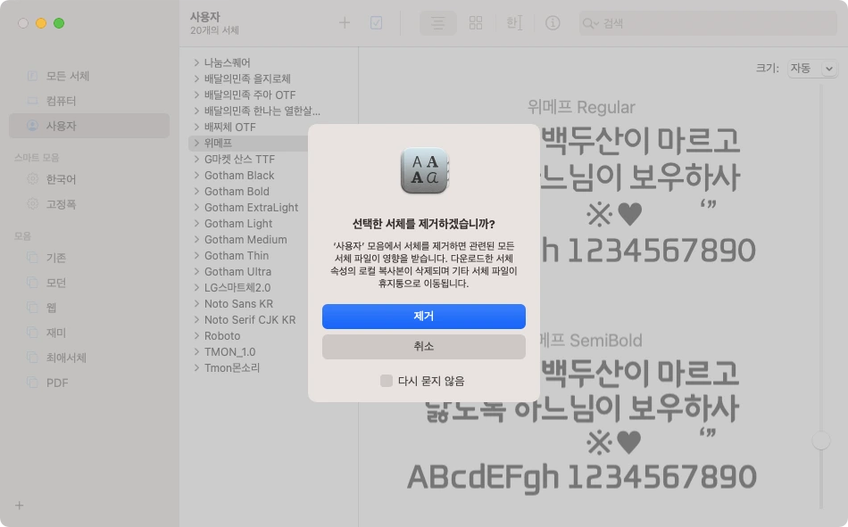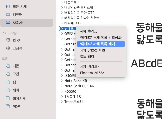 6. 서체 삭제하려면 리스트에서 오른쪽 마우스를 눌러 서체를 맥킨토시에서 완전하게 삭제할 수 있습니다.