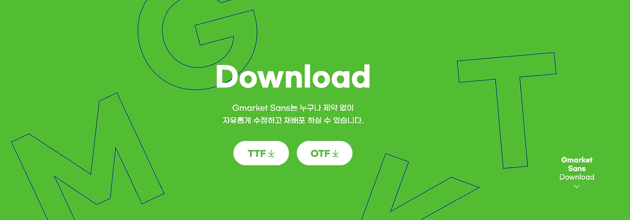 '지마켓 산스'는 2020년 온라인 쇼핑몰 지마켓에서 배포한 무료 한글 서체입니다. 다양하고 직관적인 쇼핑 경험의 철학을 서체에 담아냈고 네모 틀에 가득 채운 기하학적 글자 형태가 특징입니다. 지마켓 산스는 Light, Medium, Bold의 3가지 굵기로 제공됩니다.
