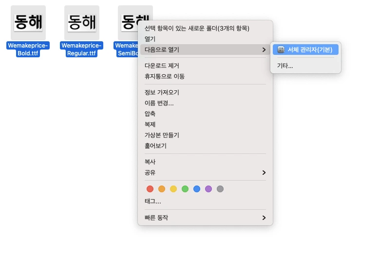 3. 개별 클릭하여 설치도 가능하지만 한 번에 설치하기 위해 3가지 파일을 드래그한 후 오른쪽 마우스 클릭하여 [다음으로 열기] [서체 관리자(기본)]을 선택합니다. 창이 뜨면 [서체 설치] 버튼을 누릅니다.