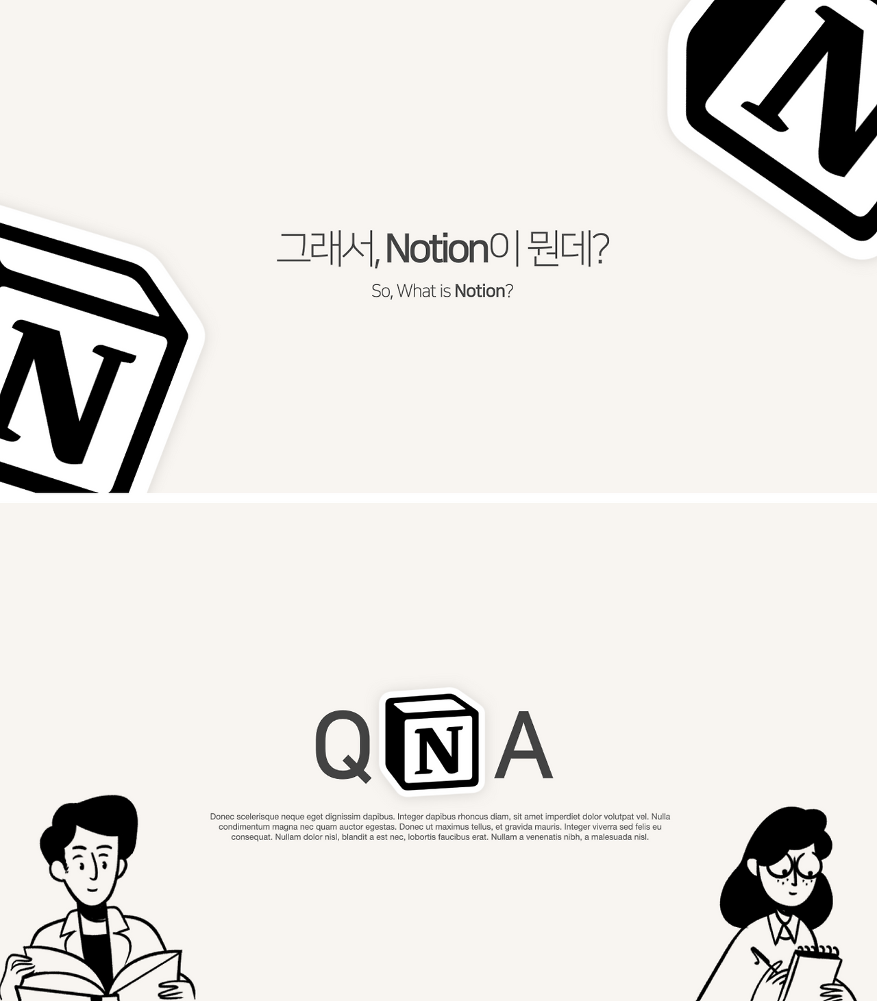 배경 슬라이드가 미색, 텍스트 컬러가 무채색인 회색이 사용되었습니다.