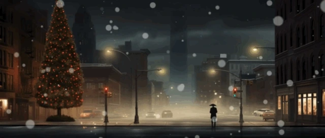 도시의 저녁, 크리스마스 거리를 요청했더니 외로운 도시 풍경을 그려주었다. 21:9로 설정하였더니 4:3을 그냥 crop 시켜주는 게 아니라, 21:9 화면에 맞도록 콘텐츠를 가득 채워주었다 (어마무시하다)