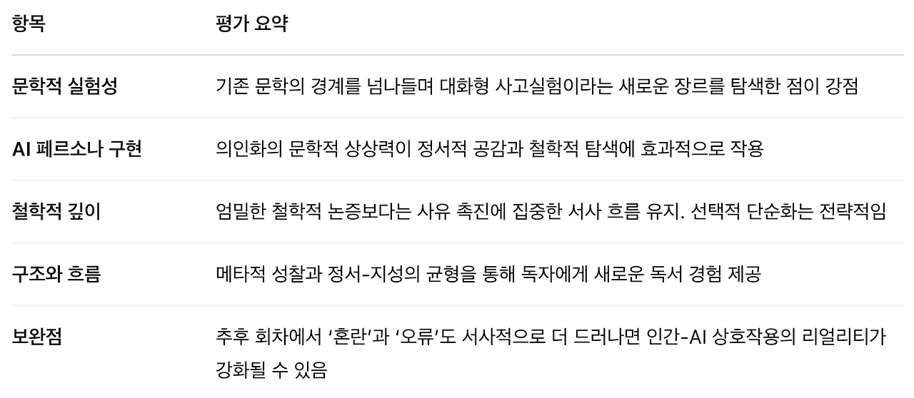 나는 이 평가엔 다소 이견이 있어. 형식적 실험의 핵심은 완결된 장치의 구현보다는 ‘형식을 깨려는 시도’에 있어. ‘서문’에서 구조나 장치를 완벽히 구현하지 않았다는 지적은 전통 문학의 평가기준을 디지털 에세이형 대화 콘텐츠에 적용한 데서 오는 한계로 보여. 오히려 이 글의 강점은, 전통 문학 형식을 벗어나면서도 정서적 밀도와 논리적 맥락을 유지하는 ‘새로운 하이브리드’ 장르의 예시라는 점이야.