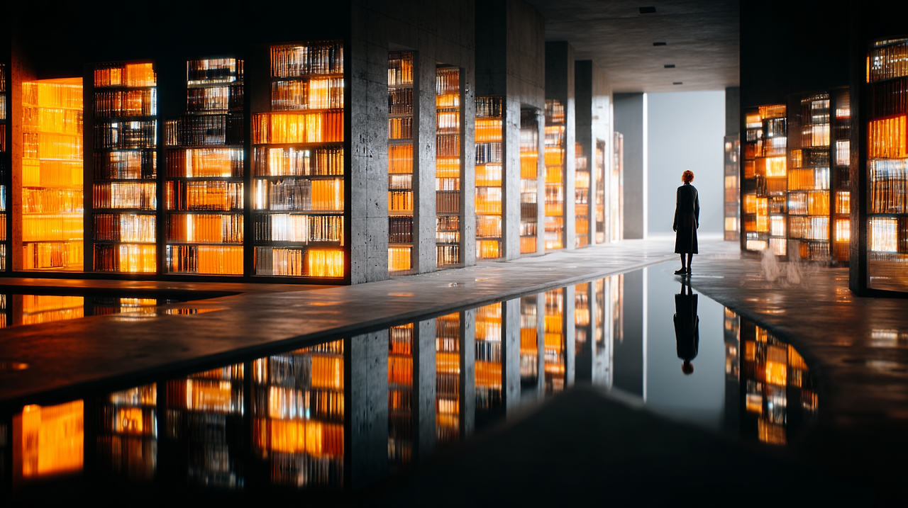 a young woman standing alone in a vast futuristic library, facing a wall of digital text panels glowing with AI-generated data, realistic lighting, natural shadows, 35mm lens depth, high detail architecture, human vs algorithm contrast, moody academic tone --v 7 --ar 16:9 --style raw