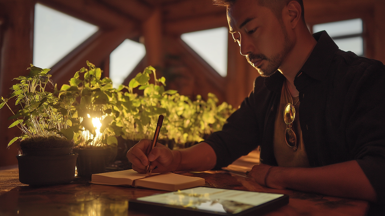 a Korean man in his 30s sitting quietly at a wooden desk near a window in a sunlit modern library, writing thoughtfully in a paper notebook while a tablet next to him softly glows with AI-generated content, warm natural light, soft ambient atmosphere, indoor plants in the background, calm and reflective mood, cinematic documentary style, realistic facial expression, thoughtful eyes --v 7 --ar 16:9 --style raw